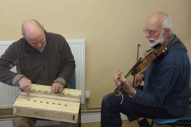 By lunchtime we had a dulcimer for our string band! The 3 strings on the box dulcimer were all tuned to an E note, which meant it could be played in the key of A with the fiddle.
